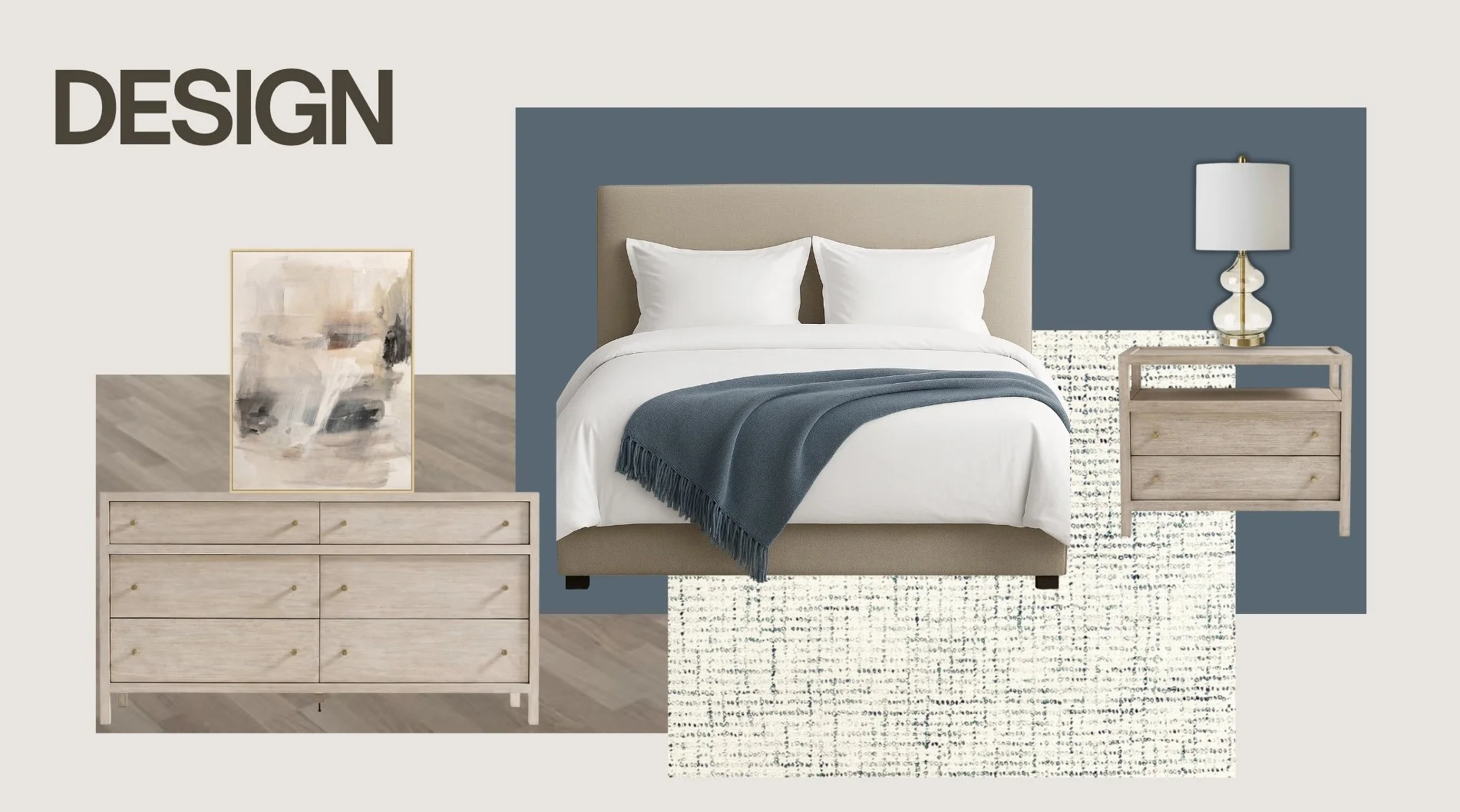 We went for a cozy, modern-rustic vibe with earthy neutrals and a soft blue accent wall to add some depth. The natural wood tones and layered textures make it feel super inviting—perfect for relaxing after a day on the lake.